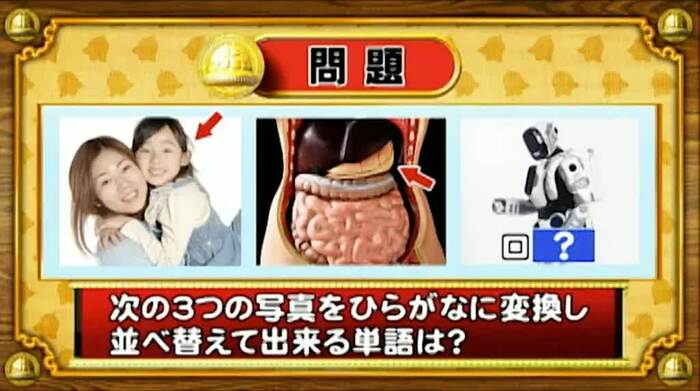 最初は「脳ミングアップクイズ」から、シャッフル写真の問題。次の3つの写真をひらがなに変換し、並べ替えて出来る単語は何か答えよ。