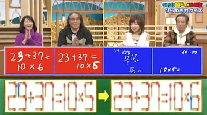 正解は、まず、左の式の「9」から1本取って「3」にする。それを右の式の「5」に足して「6」にする。そうすれば「23+37=10×6」となる。牧野と小島の2人が正解!