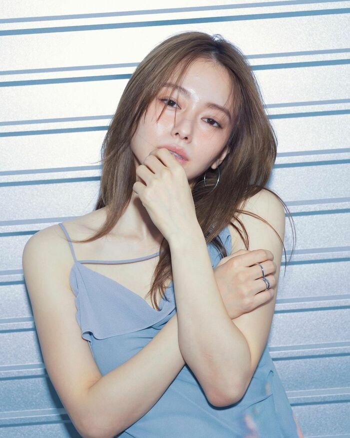 山本さんは青いハートの絵文字とともに、デコルテあらわな淡いブルーのキャミソールワンピースを着たオフショットを公開。
