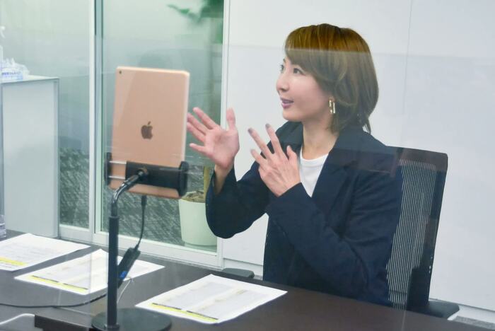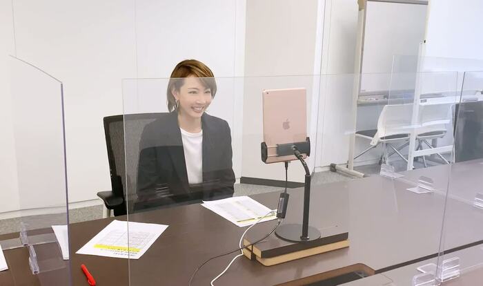 緊張した面持ちの柚希だが、試しに、スタッフが参加者役となってテスト通話をすると「聞こえます?」と笑顔で手を振り、ホッとひと安心したよう。その後も、より良い角度で画面に映るようカメラの位置を調整するなど、こだわりを見せる。