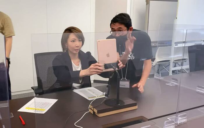 柚希は、1対1のオンラインでファンと交流するのは初めてだそう。スタッフから、会の進行や機械の操作について説明を受けると、真剣な表情で耳を傾けていた。