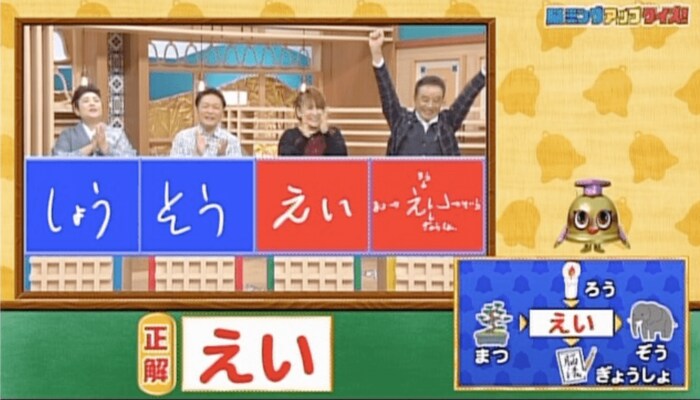 服部浩子さんは「しょう」、山口勝平さんは「そう」と回答して不正解。松本梨香さんと渡辺正行さんが正解でした。