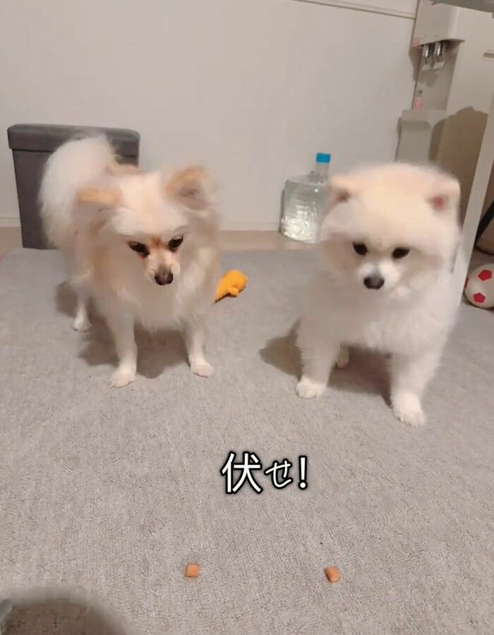 2匹ともおやつに釘付けですが、飼い主が「伏せ!」と声をかけると…