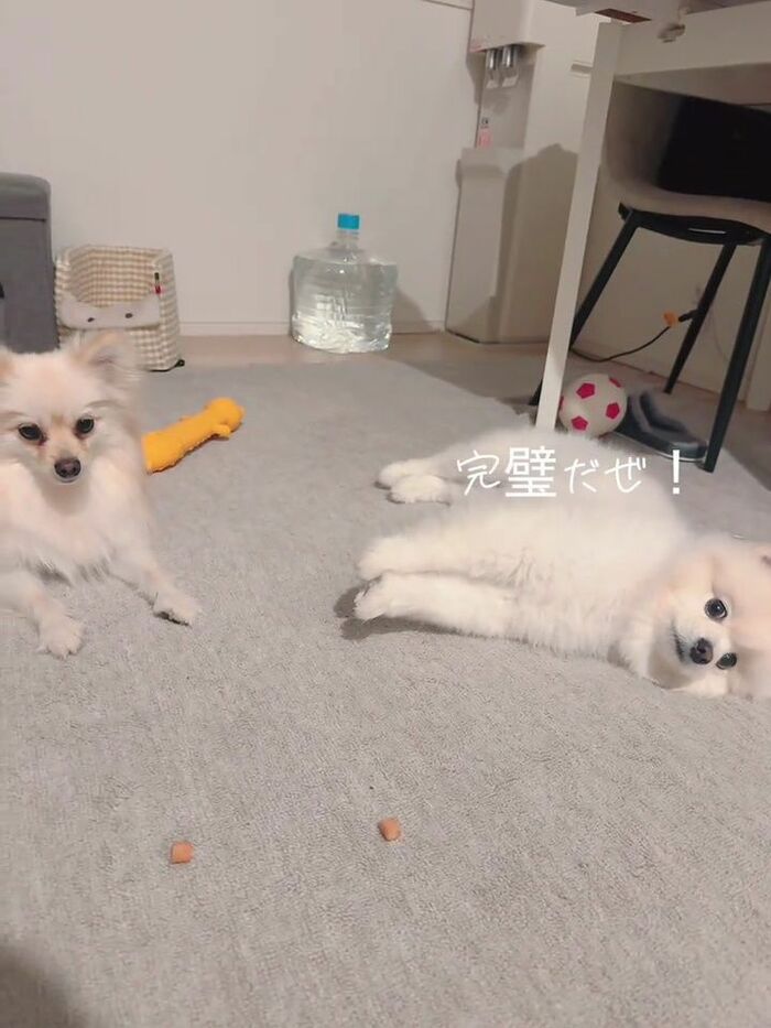 別の日の投稿でも、飼い主が「伏せ」と声もかけても、右側で平然とした表情で伏せるウニくんの横で、また自信満々な表情で思いっきりひっくり返ってしまうベアくん。