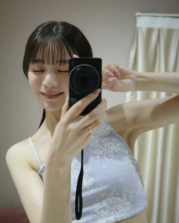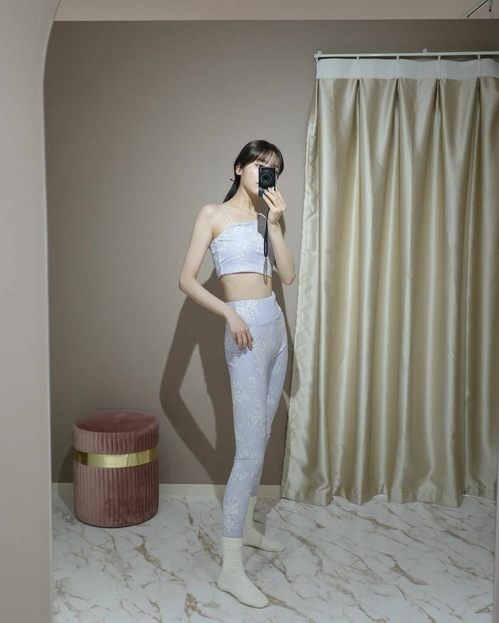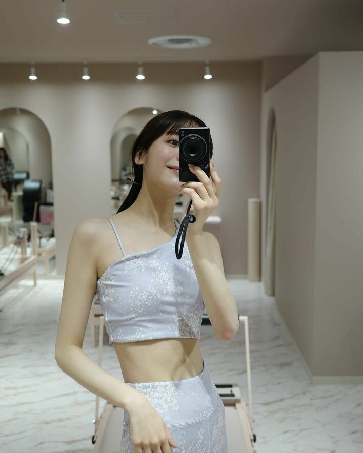 貴島さんは「春色でかわいい!ありがとうございます」と、誕生日プレゼントでもらったという淡いブルーのピラティスウェアを着てデジカメを片手にした自撮りショットを公開。