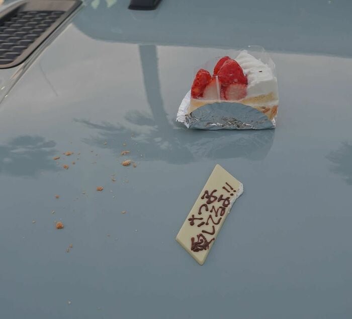 そして、別の写真を見てみると、ボンネットの上にケーキが置かれ、メッセージプレートはケーキの上から落ちて直接「サツ子」に乗ってしまっていて、周りにはケーキのスポンジ部分が一部ぽろぽろと落ちているではありませんか…!