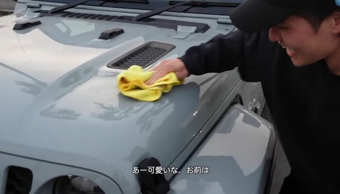 「あー、可愛いな、お前は」と言いながら車のボンネットを綺麗に拭いているたつやさん。