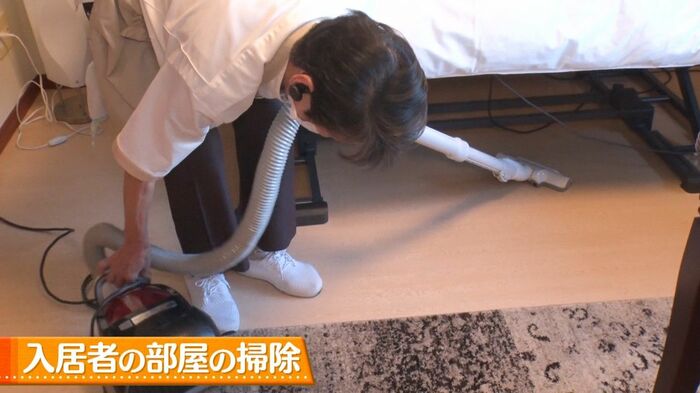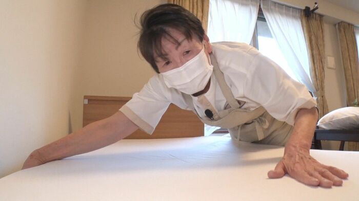 腰をかがめながら隅々まで丁寧に掃除機をかけ、ベッドメイキングも一切手を抜きません。使う人の快適さを考え、11分もかけて整えました。