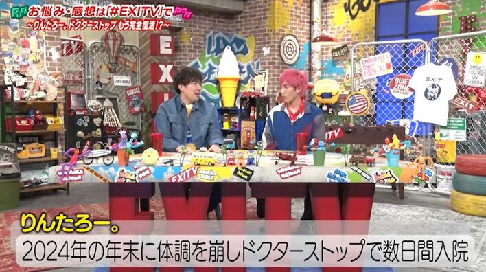 EXITがゲストとリラックスしたトークを繰り広げる『EXITV』(フジテレビ)。2月25日の放送回のオープニングトークでは、りんたろー。さんが2024年の年末に体調を崩して数日間入院した際の出来事が明かされました。