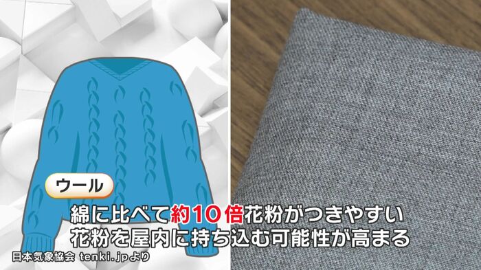 ウール製の衣類は綿素材の衣類に比べて花粉が約10倍つきやすく、花粉を屋内に持ち込む可能性が高まるといいます。