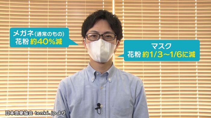 日本気象協会によると、メガネを着けることで目に入る花粉量は約40%減少。マスクを着けることで花粉を吸い込む量を約3分の1~6分の1に減らすことができるといいます。