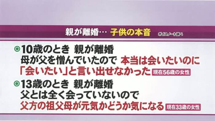番組公式SNSには「離婚しても子どもにとっては父と母」「離婚しても親は親」という意見が集まる一方、「DVで離婚した以上、子どもには会わせたくない」などの本音も多数集まった。