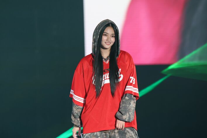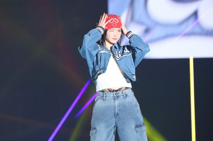 希空さんは、ブラウンのジャージ風のトップス、デニムと異素材を合わせた特徴的なミニスカートにハンチングを合わせたスタイルで登場。キュートな笑顔を振りまき、観客をくぎづけに。