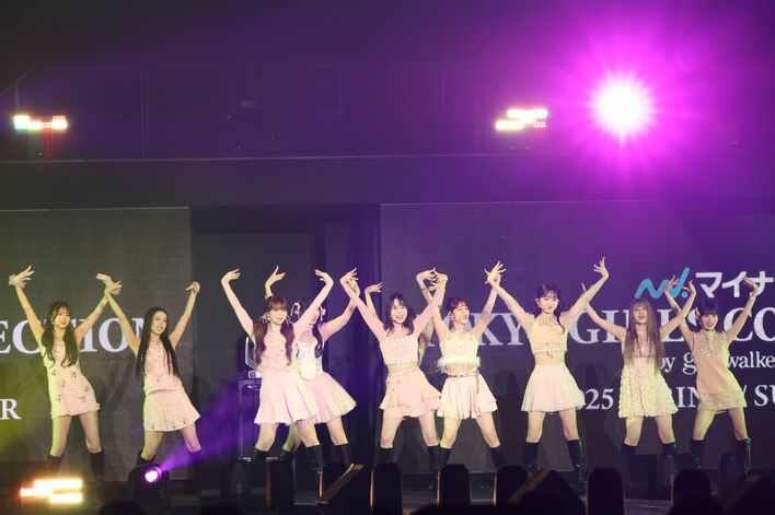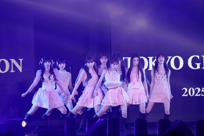 COCOROさん、MIUさん、MOMONAさん、RANさん、SHIZUKUさん、AYANEさん、KEIKOさん、KOKONAさん、RINONさん、SUZUさんが淡いピンクの衣装で登場すると、会場からは大歓声が。立ち上がる人も多数で、メンバーを呼ぶかけ声が響き渡ります。