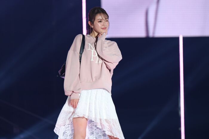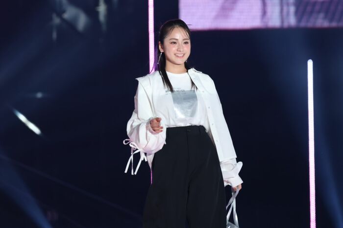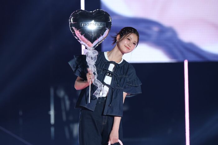 このパートのトリは生見さん。フリルが印象的なデニムのセットアップを着用し、さわやかなまとめ髪に水玉のカチューシャ。手にはハートのバルーンを持ち、左右に振りながら客席の声援に笑顔で応えました。