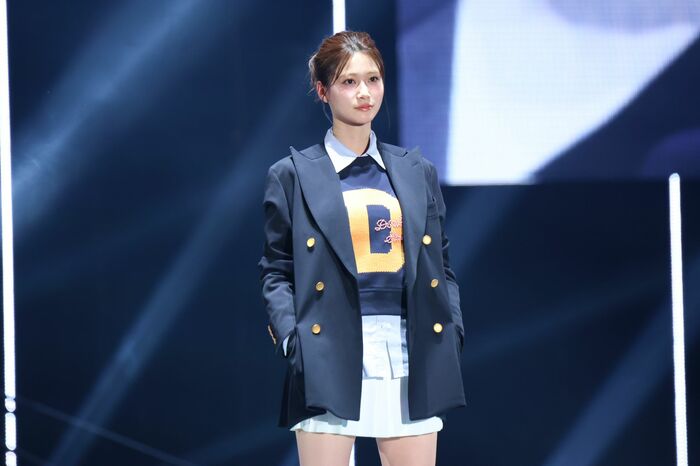 紺のブレザーに白いミニスカート、足元は黒のロングブーツ姿でウォーキングを披露。ステージの横で大きく手を振る様子には、会場からひと際大きな声があがりました。