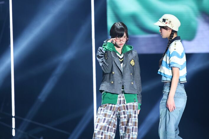 あのさんは、赤いフレームの眼鏡にふたつ結びのキュートなヘアで登場。ブレザーに緑色のフーディをイン、ラフなチェックのパンツといった、個性的であのさんらしいプレッピースタイルで会場を沸かせます。