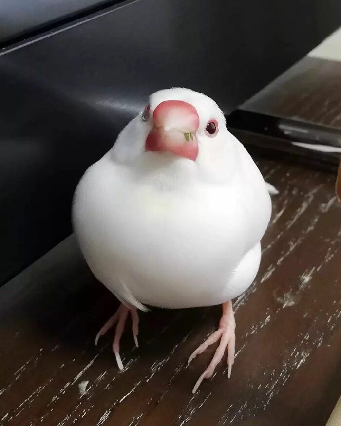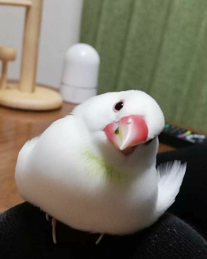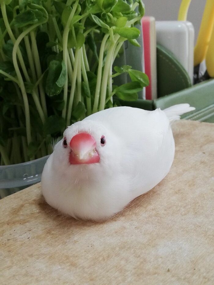 首をかしげながら、つぶらな瞳でこちらを見つめるのは、真っ白な羽根とピンクのくちばしが魅力的な6歳の文鳥「笹」ちゃん。