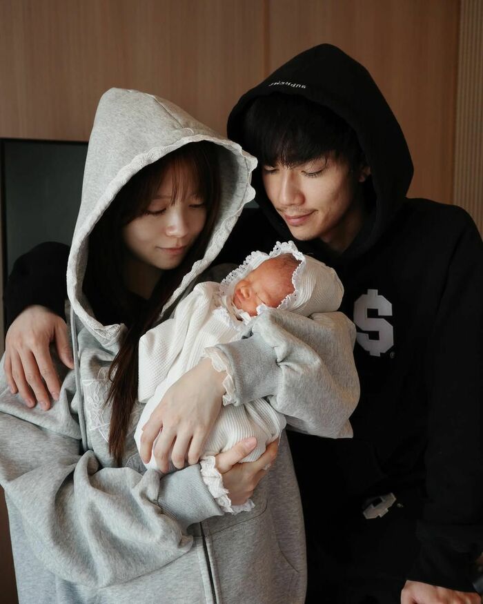 グレーのパーカー姿の桜井さんと、黒いパーカー姿のぎしさんは、それぞれフードをすっぽりかぶり、桜井さんの腕に抱かれた白いベビー服姿の息子を、愛おしそうな表情で見つめています。