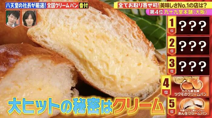 4位は、大阪府枚方市の「九十九堂本舗」の「ツクモのクリームパン」だ。やわらかいクリームとふかふかのパンが人気を呼び、1日2000個以上を売り上げている。