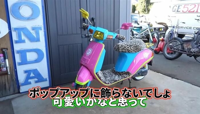 シートから外れ、姿を現したスクーター!なんと蛍光色のピンクやブルー、イエローカラー!座席や足元部分にはヒョウ柄のデザインも。ミラー部分にはピースのようなポーズをするカラフルな手がついています。