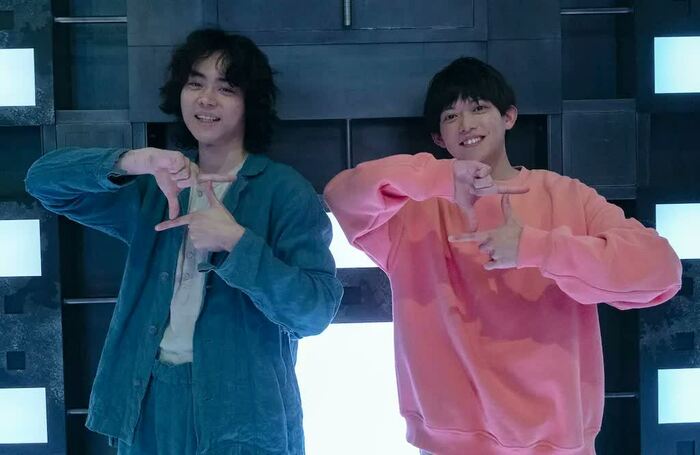 また、松丸は現場で、千陽役の⽥代輝とも対⾯。松丸の⼤ファンだという⽥代は、劇中では⾒られない満⾯の笑みを見せ、両⼿の親指と⼈差し指を使った「CUBEポーズ」で、松丸さんと記念撮影をしていた。