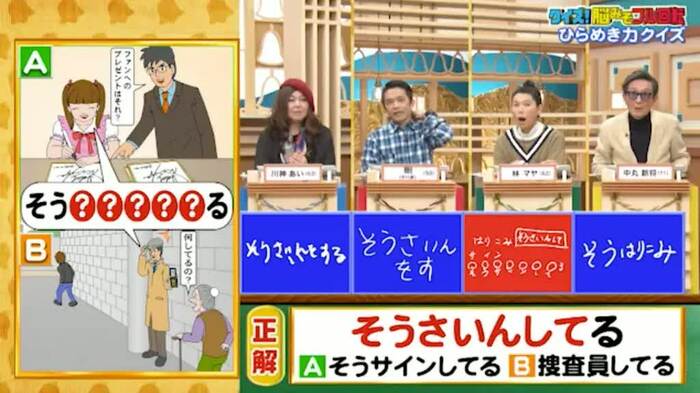 正解は「そうさいんしてる(そうサインしてる/捜査員してる)」。林1人が正解。お見事!