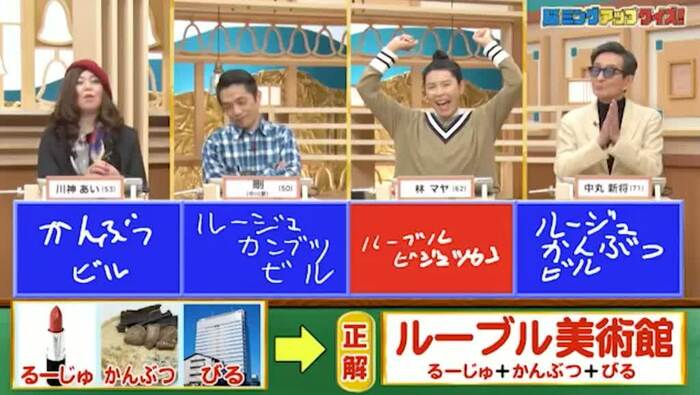 正解は、「ルーブル美術館(るーじゅ+かんぶつ+びる)」。林1人が正解!