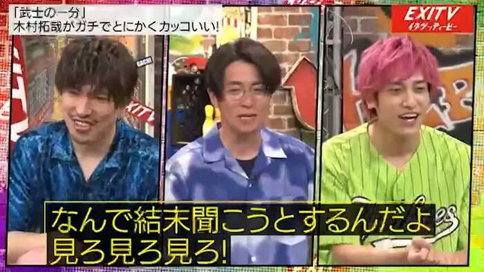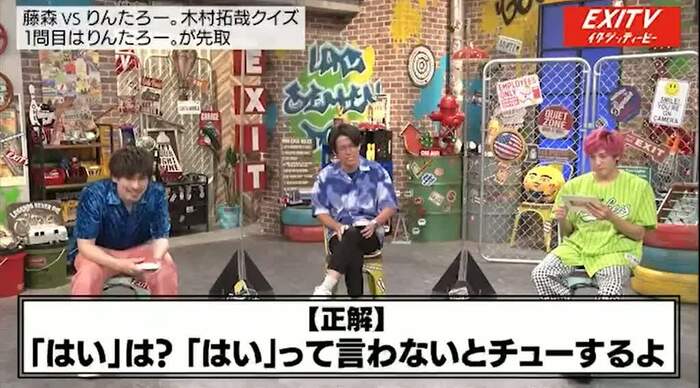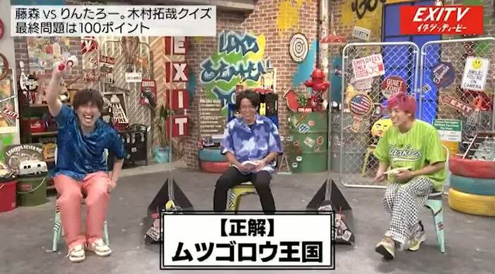 兼近が問題を読み上げている途中で、またもや早押し対決に。今回も早押し対決をタッチの差で制したりんたろー。は「ムツゴロウ王国!」と回答してまたしても正解をゲットした。あまりの盛り上がりに「もう『EXITV』に呼ぼう」と木村をゲストに迎えようと兼近が提案すると、藤森は「そのときは観覧でもいいから来させてよ」と懇願していた。