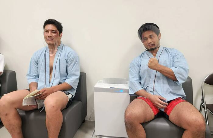 撮影現場に先に到着したのは、シビサイ選手と宮本選手。アザのメイクがほどこされ、ごつい体が痛々しく見える。他の出演者と共に、前室と呼ばれる控え室でスタンバイするふたりは、少々緊張ぎみ!?