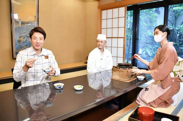 松岡は伝統の牛鍋の味に「お肉を食べる形がここから始まったと考えたら、古いんでしょうけど、僕にとってはものすごく新鮮でした」と感想を伝えた。