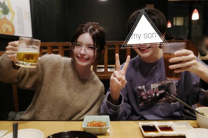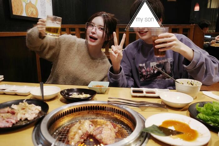 「息子と焼肉食べ放題!」というコメントとともに、高校生の息子と乾杯をするような親子2ショットを公開しました。