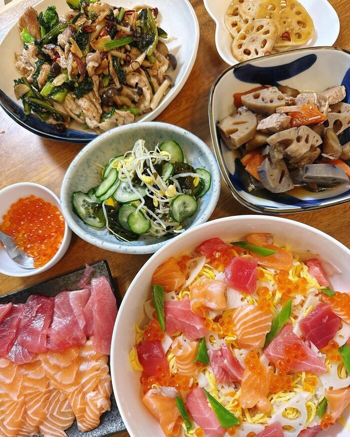 最後には、ちらし寿司や煮物など手料理の写真も公開。サーモンやいくら、サヤエンドウがちりばめられたちらし寿司は西野さんの手作り!西野さんはハッシュタグで、「久しぶりに料理頑張りました」と付け加え、愛情たっぷりでにこりちゃんの初節句をお祝いしました。