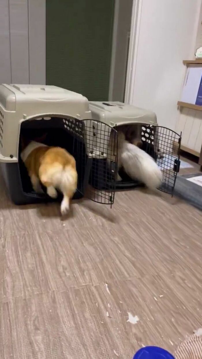 飼い主もこの2匹の姿には、「逆逆!と思いながら見ていました(笑) でもサイズ感は違いながらもどちらもきちんとクレート(キャリー)には入ったので2匹がそれでいいならいいか…と」と心の中でツッコんでしまったよう。