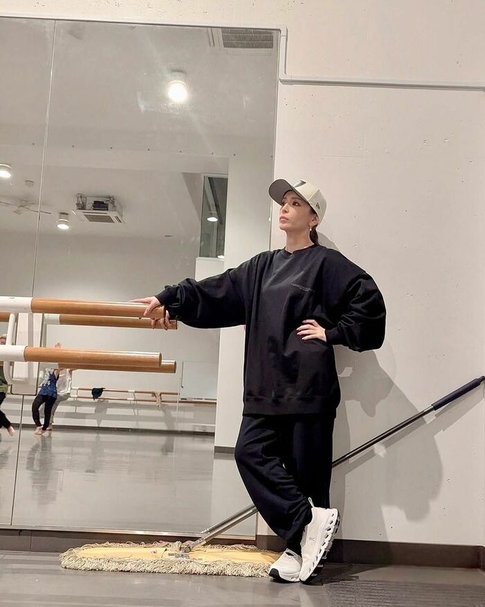 公開された写真には、上下黒のスウェット姿でベージュのキャップをかぶった浜崎さんが、腰に手を当て、真剣な表情を見せている様子が!
