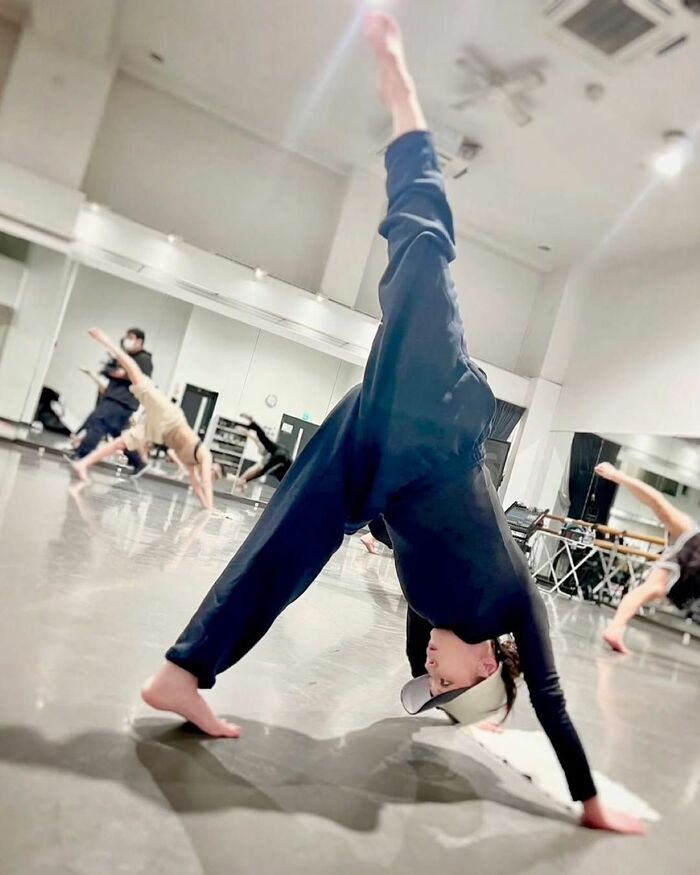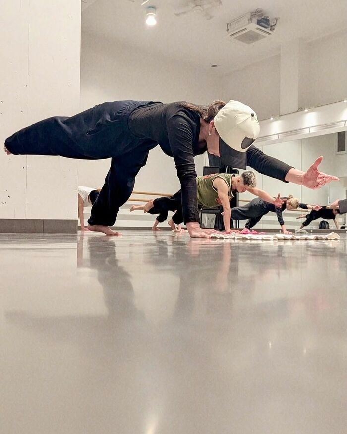 さらに別の写真では、手足を床につけ、右足を天井に向けて高く上げたポーズをしている写真も公開し、しなやかな体を披露!
