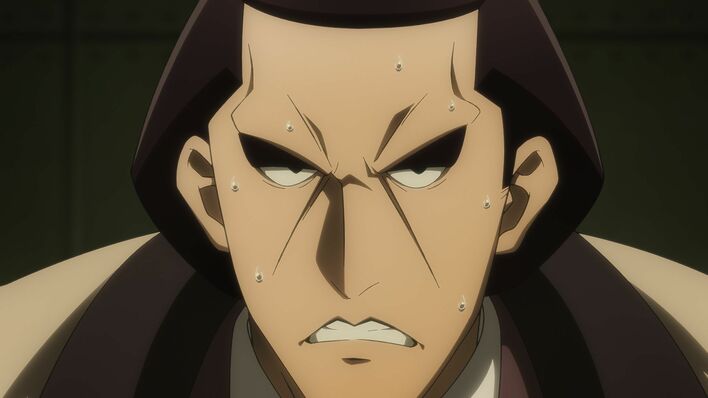 本条鎌足(cv.村瀬歩)と刈羽蝙也(cv.逢坂良太)に⽴ち向かう荒⼾流作(cv.安元洋貴)。