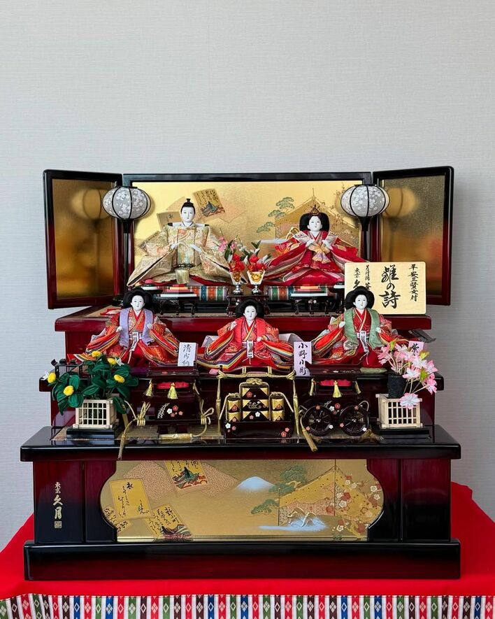 男雛と女雛に三人官女と豪華なひな人形を披露し、「昔ながらって感じですんごいカッコいい!!!」と興奮気味に報告。