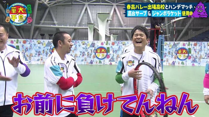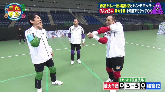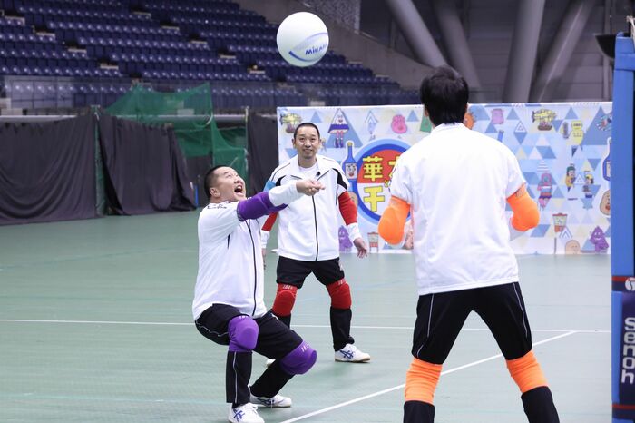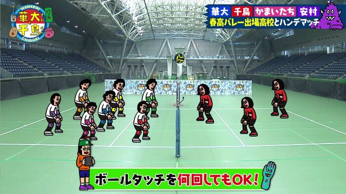 華大千鳥チーム7人vs強豪校チーム3人のハンデ戦で行い、華大千鳥チームは、相手コートに返すまで何回でもタッチOK。ボールは通常よりも大きくて柔らかいソフトバレーボールを使用。