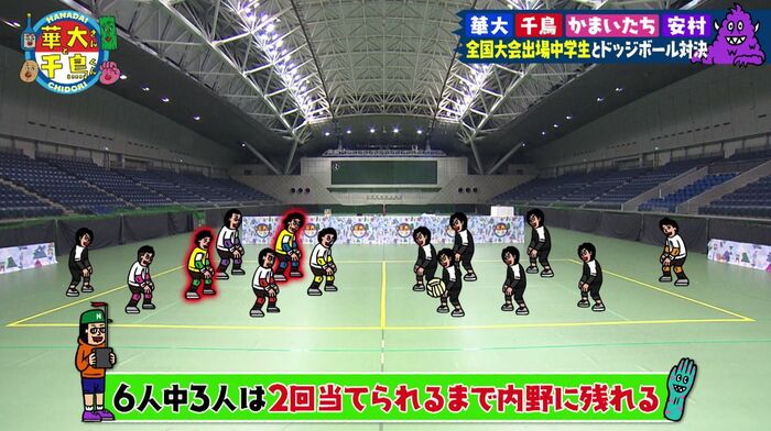 内野は6人ずつですが、華大千鳥チームはそのうち3人がライフ2つ持ちに(=2回当てられるまでは内野に残れる)。