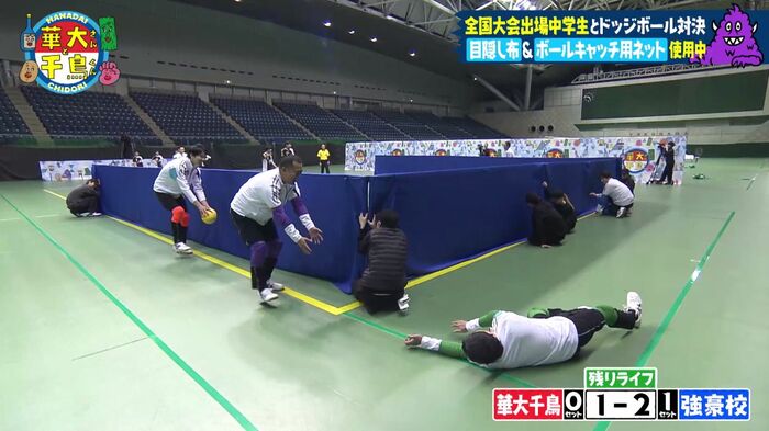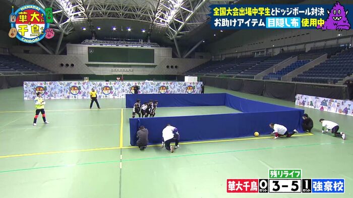 強豪チームが使える外野は1面のみで、華大千鳥チームは3面すべて使用可能。通常のドッジボールではなく、柔らかいソフトバレーボールを使用します。相手の内野を全滅させると1セット獲得。2セット先取したチームの勝利です。