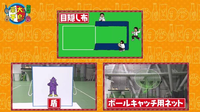 用意されたのは、相手コートのまわりを高さのある布で囲うことで、外野の誰がボールを持っているのかわからなくする「目隠し布」、ボールから身を守る大きな「盾」、大きなネットでボールが取れる「ボールキャッチ用ネット」の3つ。