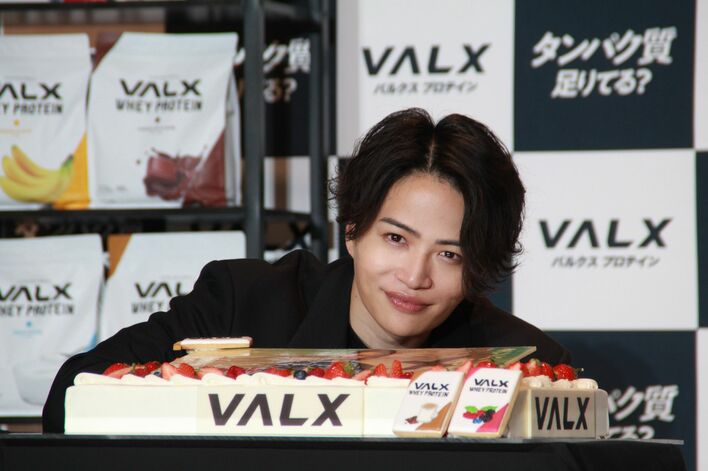 timeleszの菊池風磨さんが『プロテインブランド「VALX(バルクス)」アンバサダー就任式』に、黒いシックなスーツ姿で登場。