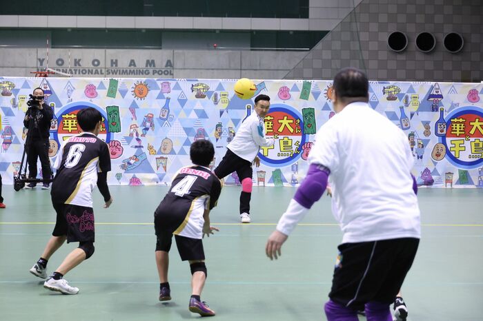 とんでもない球速に「速い速い!」「怖い!」とビビりまくる華大千鳥チーム。しかし、濱家さんが身長の高さを活かして反撃を繰り出し「いいぞ、いいぞ」と芸人たちは大盛り上がり。