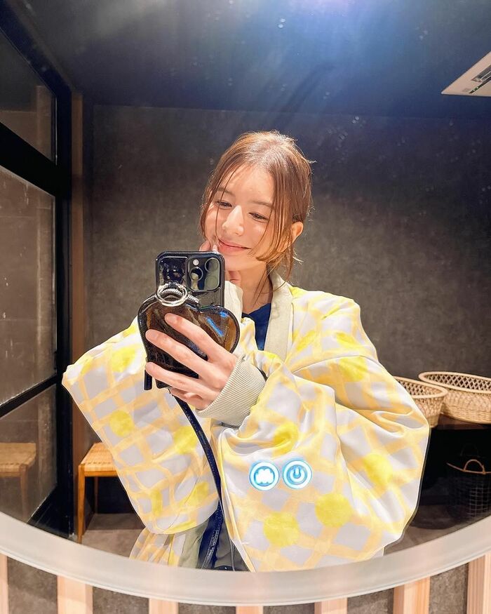 他にも、タレントの里田まいさんがプロデュースしたという、カーキと黄色を基調にしたはんてんを着たスザンヌさんが、鏡の前で笑顔を見せるショットや…