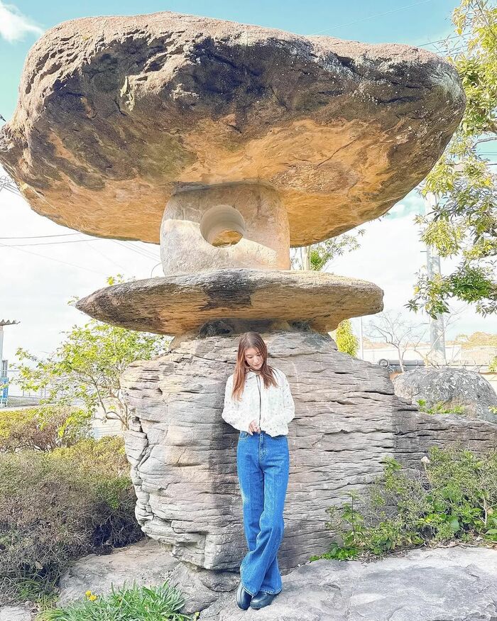 公開された写真には、白いレースのトップスとデニムパンツ姿のスザンヌさんが、旅館のシンボルである石で作られた大きな灯籠の前に立って、ポーズを決めている姿が!