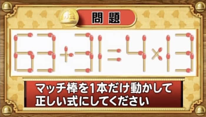 「63+31=4×13」。この式のマッチ棒を1本だけ動かして正しい式にしてください。