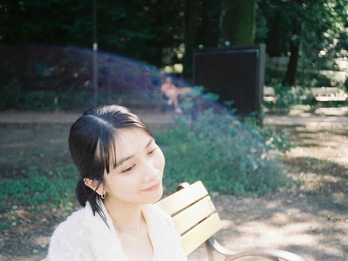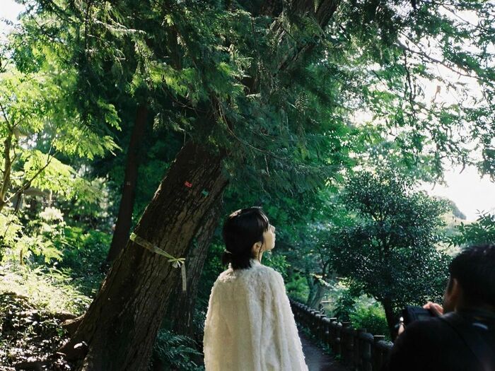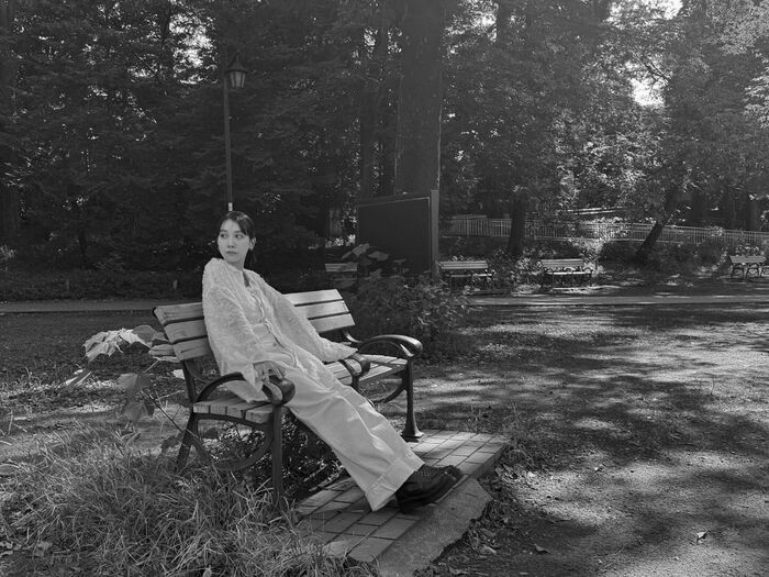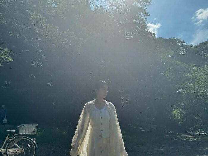 公開された写真には、白のニットとパンツにふわっとしたカーディガンを羽織ったコーディネートで、公園の木々を背景にポーズを決める松本さんの姿が!