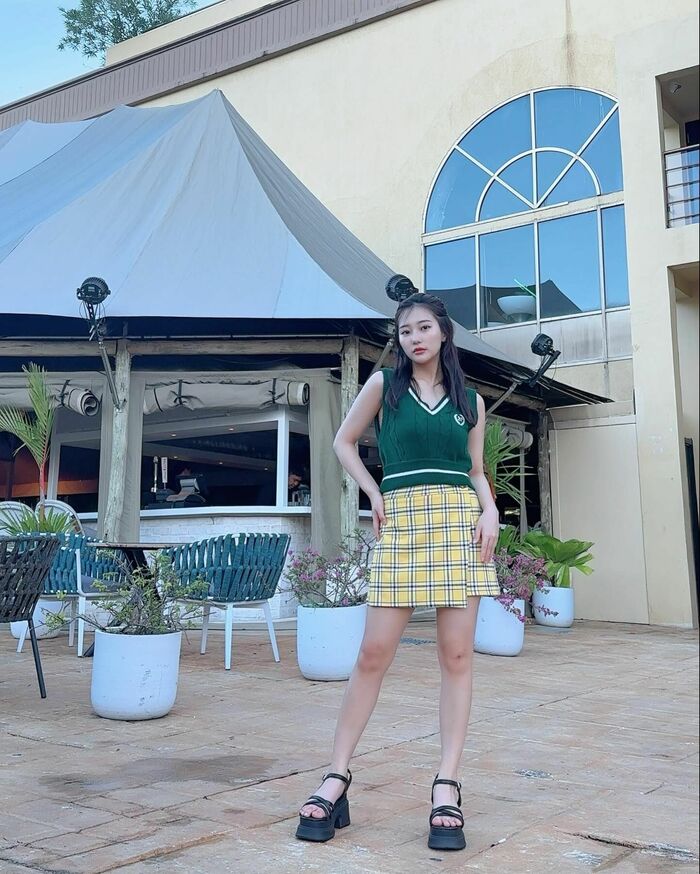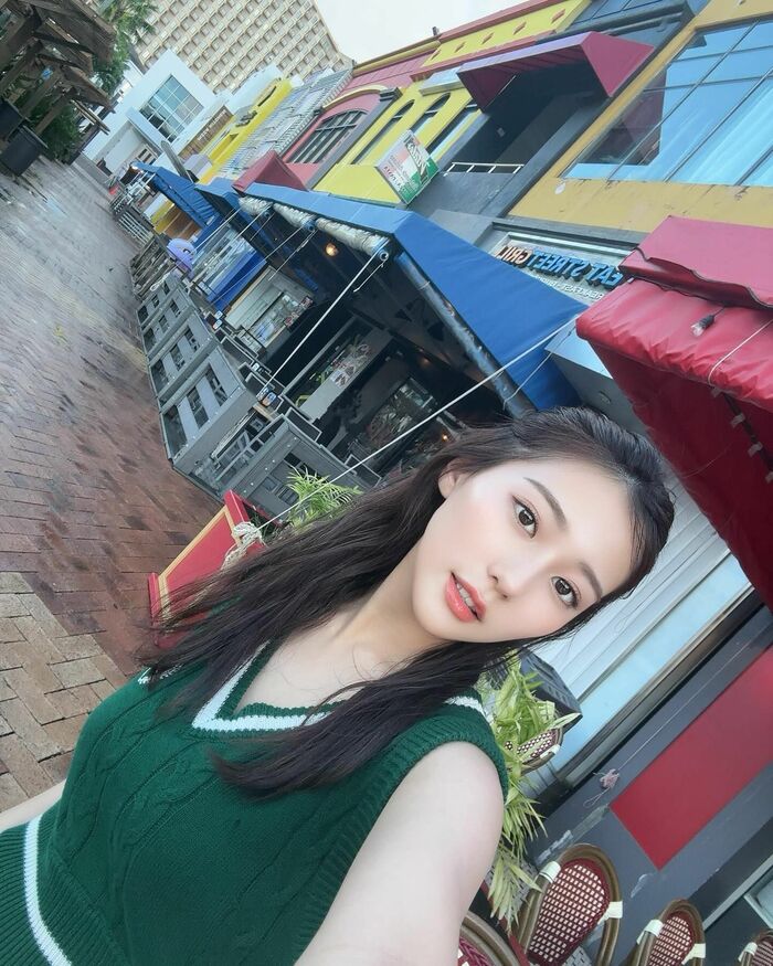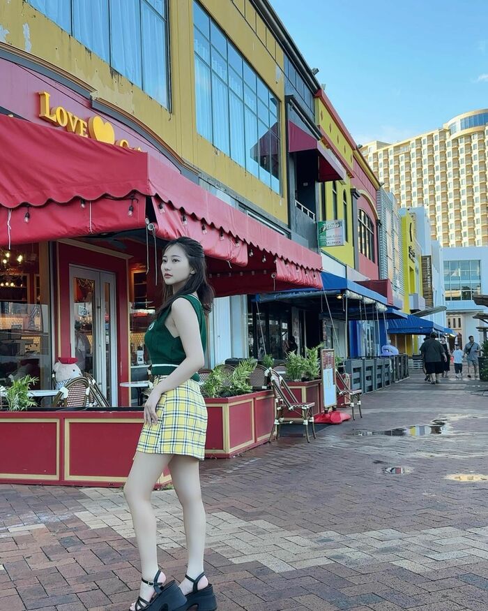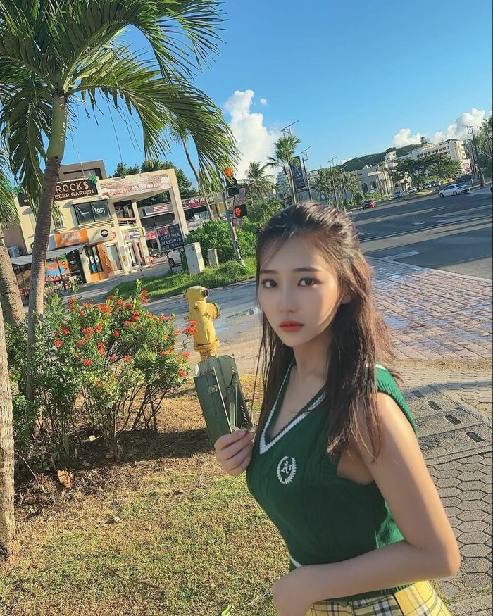 グアムの街並みの中、緑色のノースリーブニットと黄色いミニスカート姿でまたまた美脚を披露した田中さん。