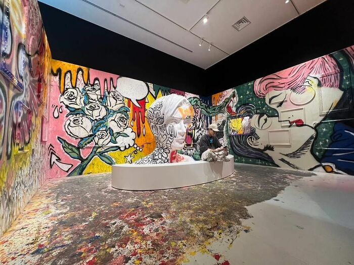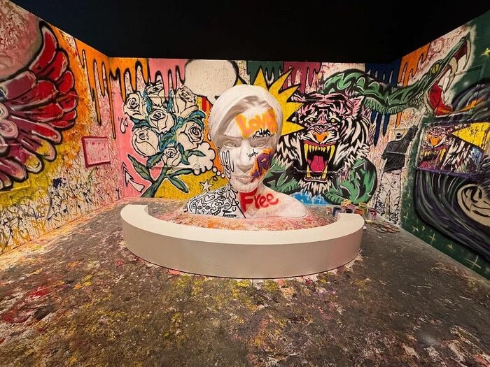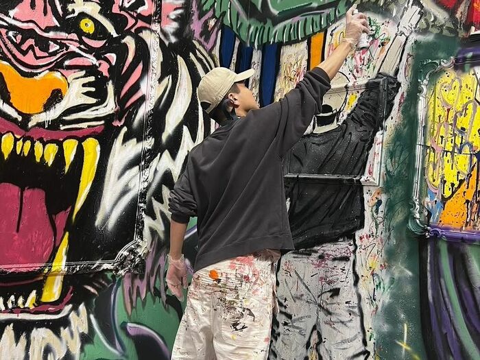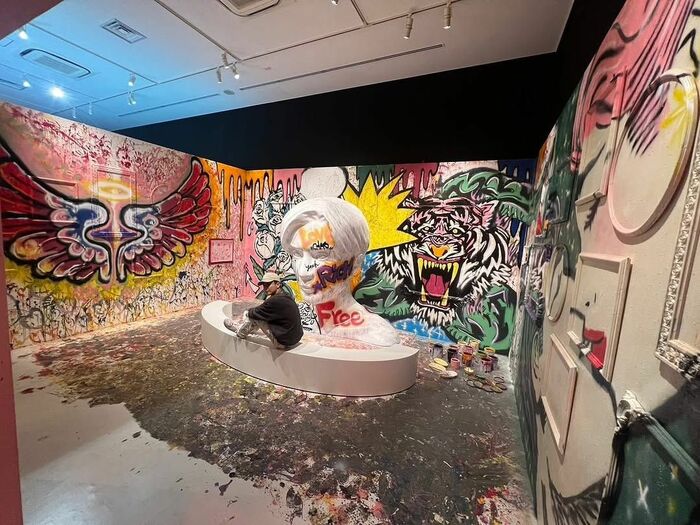 公開された写真を見ると、正面の壁の左側には以前披露していた白いバラの花束、右側には新たに描かれた鋭い牙を見せるピンクカラーのトラの姿が!真ん中にある人の顔のオブジェには、「LOVE」「Free」といった大きな文字が目に入ってきます。